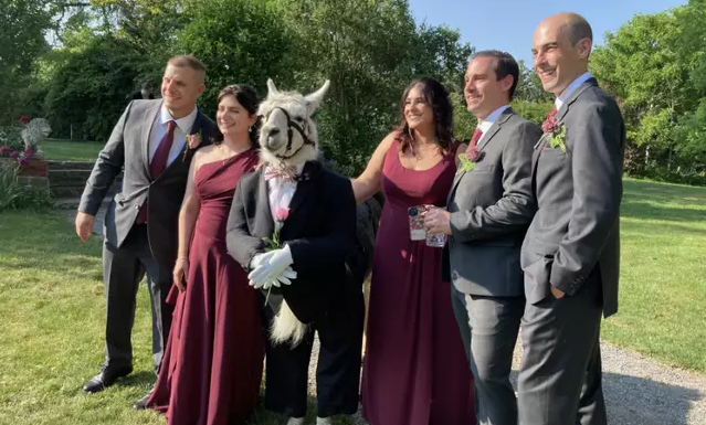 Die Menschen sind in den sozialen Medien ganz aus dem Häuschen über die Bilder eines Lamas auf einer Hochzeit, das als Trauzeuge verkleidet ist.