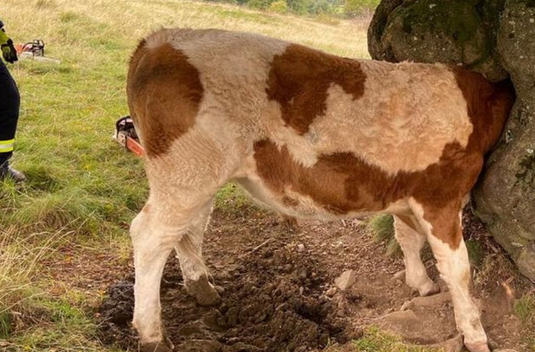 Der neugierige Ochse wurde auf einer Grünfläche am Rande des Wanderweges 10 in Ehrenberg in der Rhön (Landkreis Fulda) von einem aufmerksamen Spaziergänger entdeckt. Das Tier hatte sich mit seinen Hörnern in einem Astloch zwischen zwei Bäumen verfangen und befand sich in einer äußerst prekären Lage.