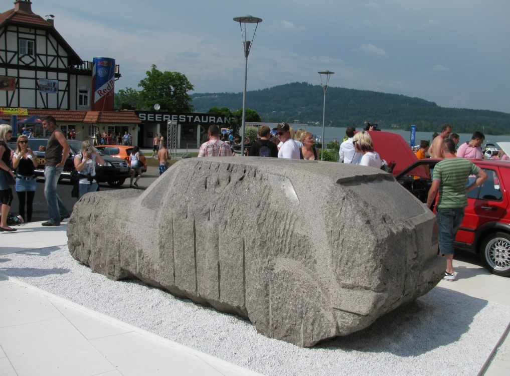 Seit 1987 ist der legendäre Golf 2 GTI aus Granit das Wahrzeichen derer, die sich jährlich auf zum Wörthersee machen, um am GTI Treffen teilzunehmen. Das "Fahrzeug aus Gestein wiegt mehr als 25 Tonnen. Immer wieder machen Schaulustige Fotos mit dem "Koloss" an Auto.