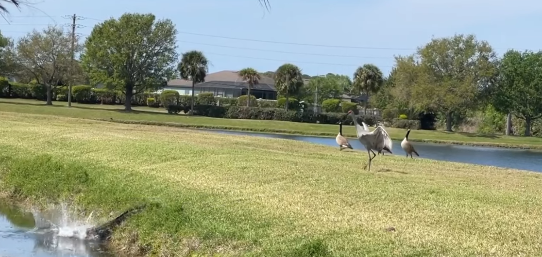Ein von Laura Akin aus Sarasota, Florida, geteiltes Video zeigt einen Kranich, der oben auf einer Böschung im Gras steht und auf einen Alligator hinunterstarrt, der langsam aus dem Wasser auftaucht.
