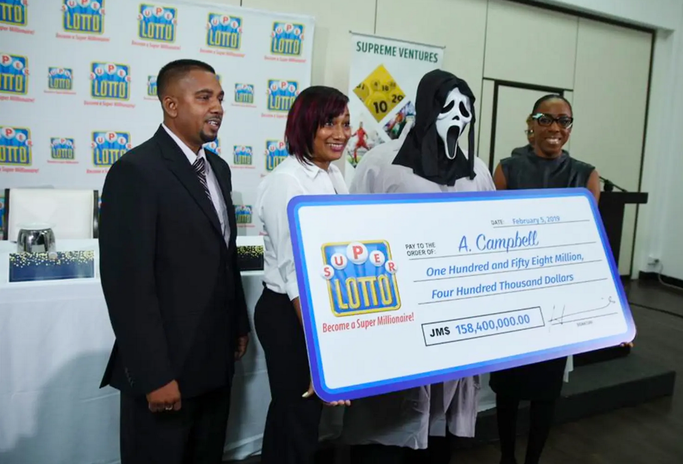 Gekleidet in eine Maske von "Ghostface" - einer Figur aus den "Scream"-Filmen mit einem charakteristischen weißen Gesicht und einem langen, weit geöffneten Mund - kassierte der Gewinner, der nur als A. Campbell identifiziert wurde, seinen Gewinn von rund 158.400.000 $ in jamaikanischen Dollar, was mehr als 1.171.400 in Euro entspricht. Nach Angaben des Jamaica Star wurde Campbell krank, bervor er erfuhr, dass er im Superlotto gewonnen hatte, nachdem er einen Schein für 1,48 Euro gekauft hatte.