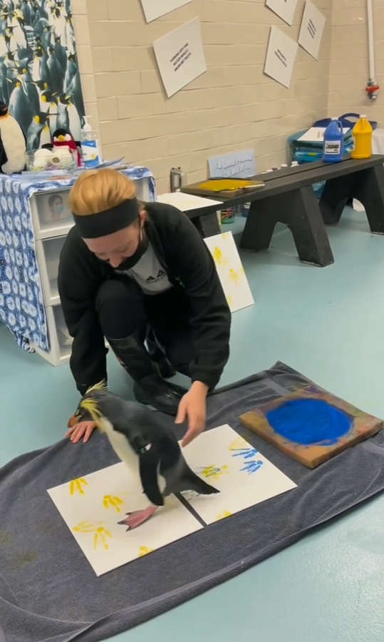 Herzige Einlage dieses Pinguins. Das Tier versucht mit mehreren Farben ein Kunstwerk zu zeichnen. Das Netz ist begeistert.
