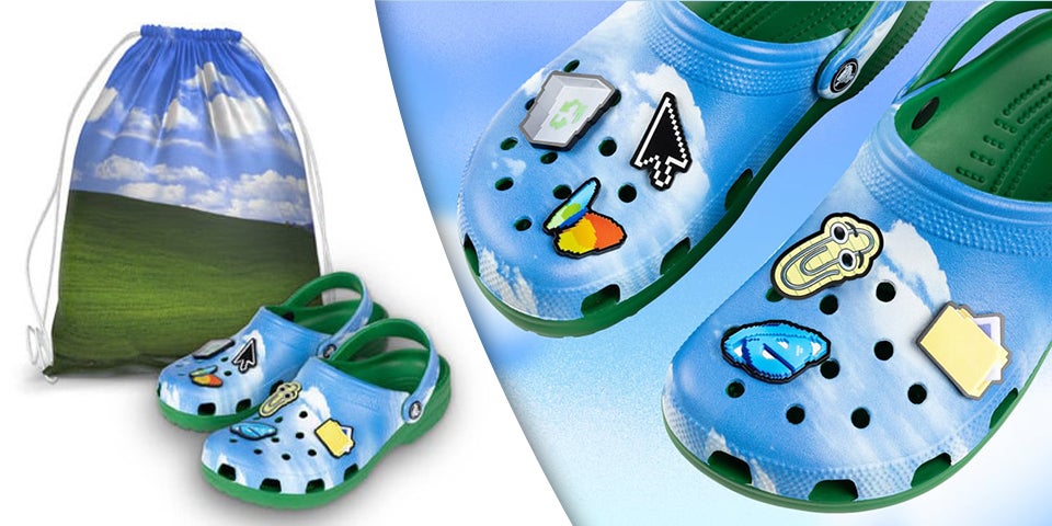 Zum 50. Geburtstag hat Microsoft einige neue Fanartikel vorgestellt. Besonders ins Auge stechen dabei Gummischuhe der Marke Crocs. Diese sind vollständig mit dem bekannten Windows-XP-Hintergrund bedruckt – samt grasgrüner Sohle.