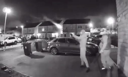 Auf dem Video aus Bradford, West Yorkshire, ist zu sehen, wie ein Mann auf eine Tür mit einem Vorschlaghammer einschlägt, während sein Komplize eine Schrotflinte nachlädt. Dann ist eine Frau zu hören, die ruft: "Gehen Sie aus dem Haus!", und man sieht, wie der Schütze in ihre Richtung feuert.