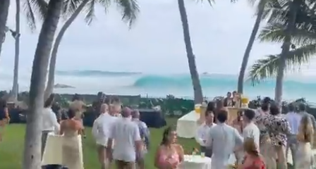 Eigentlich sollte es der schönste Tag für das frisch vermählte Brautpaar werden. Stattdessen erlebte die gesamte Hochzeitsgesellschaft am Montag in Kaulua-Kona, Hauptinsel Hawaii, einen Schock. Eine Monsterwelle rast auf die Hochzeitslocation am Strand zu und schwappt über die angrenzende Mauer. Tische und Stühle werden mitgerissen, zum Glück wird aber niemand verletzt.