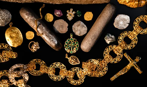 Zu den Schätzen, die darauf hindeuten, dass einige der Funde für wohlhabende Aristokraten, wenn nicht gar für Könige bestimmt waren, gehört eine kunstvolle, filigrane Goldkette mit Rosettenmotiven. Ein goldener Anhänger mit dem Santiago-Kreuz und einem indischen Bezoar-Stein, der damals in Europa wegen seiner heilenden Wirkung geschätzt wurde, hat die Form einer Jakobsmuschel, dem Symbol der Pilger auf dem Weg nach Santiago de Compostela in Galicien. Ein anderer Anhänger zeigt ein goldenes Jakobus-Santiago-Kreuz über einem großen, grünen, ovalen Smaragd, umrahmt von einem Dutzend quadratischer Smaragde, die vielleicht die 12 Apostel symbolisieren.