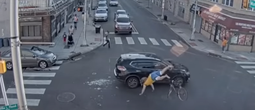 Andrew Black übersieht die rote Ampel und fährt mit seinem Fahrrad mitten auf die Kreuzung in Jersey City im US-Bundesstaat New Jersey. Dort wird er von einem Geländewagen angefahren. Der Radfahrer fliegt in die Luft, überlebt zum Glück aber leicht verletzt.