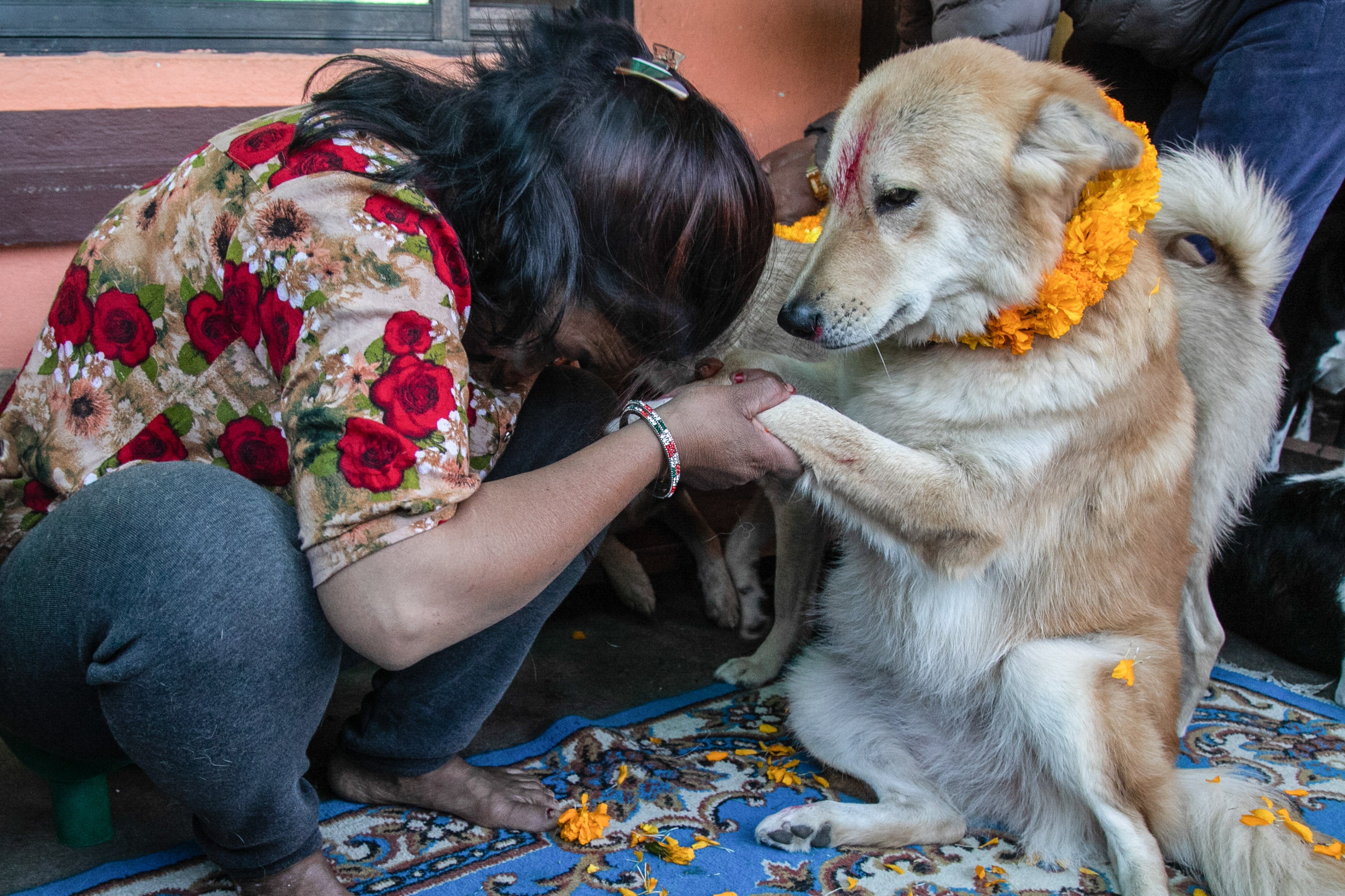 Der zweite Tag von Tihar ist den Hunden gewidmet, die in der hinduistischen Religion als Boten des Todesgottes Yama gelten. In dieser besonderen Welt Nepals werden Hunde an diesem Tag in eine farbenfrohe Welt gehüllt. Blumengirlanden schmücken ihre Hälse, als Zeichen der Verbundenheit zwischen Mensch und Tier. Ein pundra oder tika, ein markantes rotes Symbol auf ihrer Stirn, zeigt ihre Zugehörigkeit zur religiösen Tradition. Dieses Symbol wird durch das Mischen von rotem Pulver namens "abir" mit Joghurt und Reis erstellt.