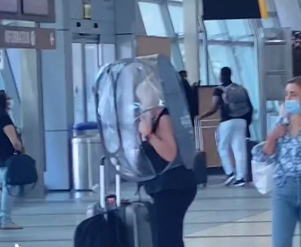 Dieses Video aus San Diego sorgt derzeit für Lacher im Netz. Darauf ist eine Frau zu sehen, wie sie gerade mit ihren Koffern auf den Flughafen spazieren geht. Die Frau trägt dabei aber nicht nur eine Maske, sie hat auch einen ganzen Anzug um ihr Gesicht geschnallt, welche die Frischluftzufuhr reduzieren soll.