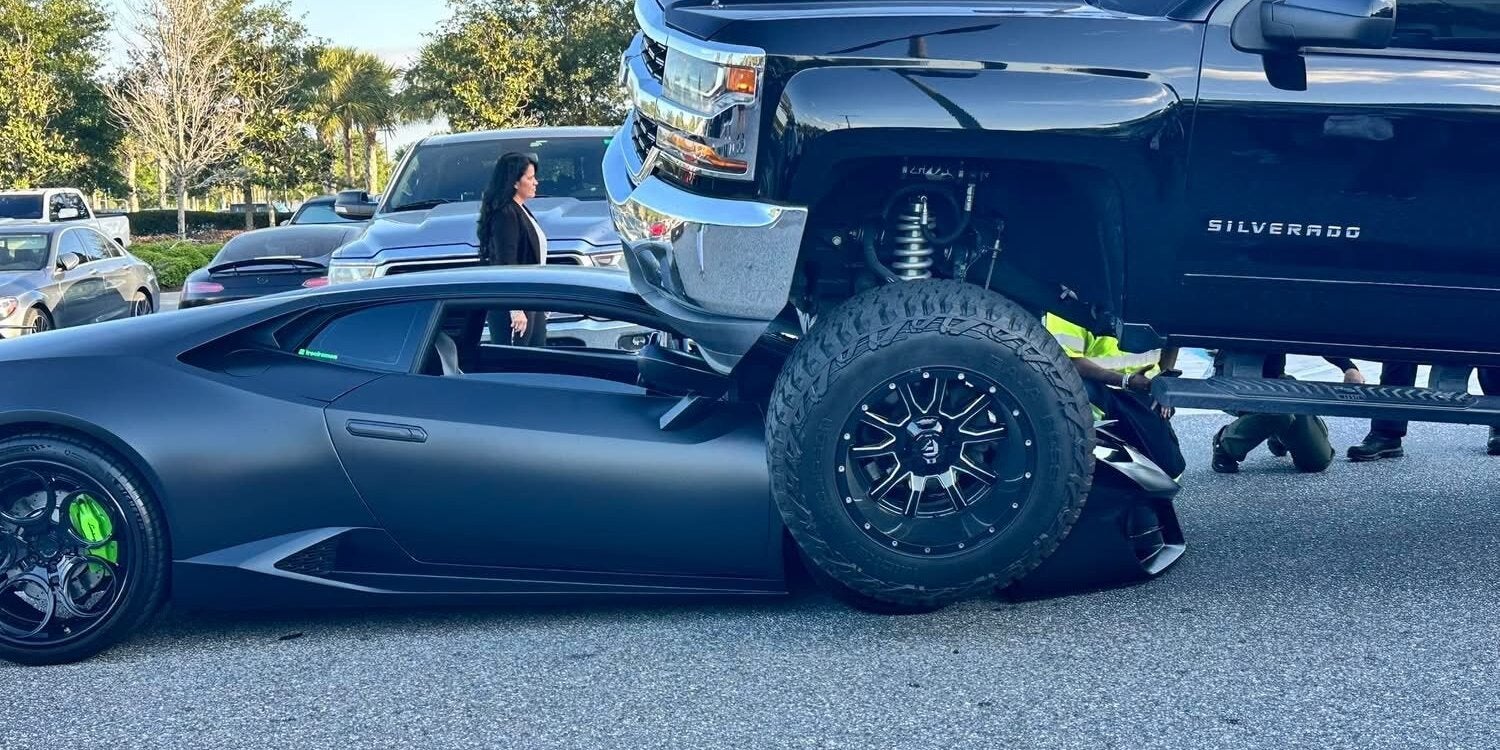 Spektakulärer Unfall in den USA: Auf einem Parkplatz im Stadtteil Lake Nona in Orlando wurde ein hochpreisiger Lamborghini Huracán von einem Pickup-Truck regelrecht überrollt.