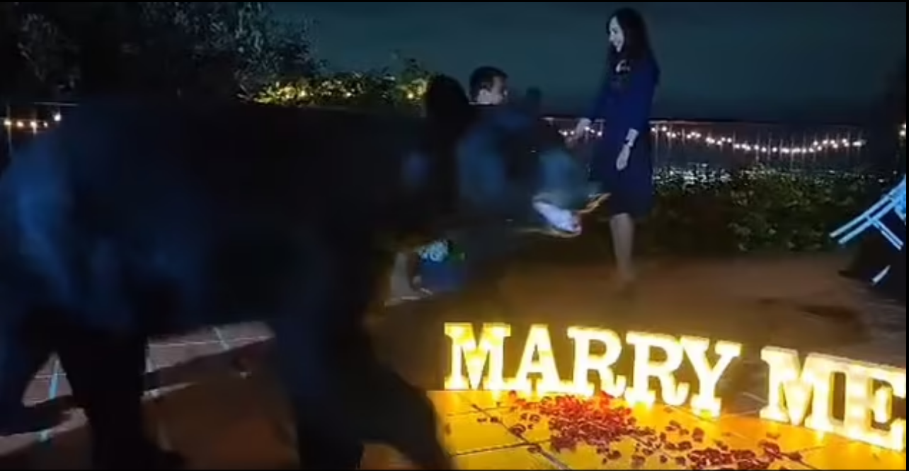 Der Schatten, stellte sich heraus, kam von einem Schwarzbär. Dieser ging, unbehelligt von dem Rosenteppich und beleuchteten "Marry Me" Buchstaben, genau zwischen der Kamera und dem Pärchen hindurch. Die nun Verlobten blieben erstaunlich ruhig und trugen auf ihren Gesichtern sogar noch ein leichtes Lächeln. Vermutlich waren sie von den überschwänglichen Gefühlen so überwältigt, dass nicht einmal ein Bär diese dämpfen konnte. Der Bär war kein Besucher, sondern nur ein Passant, weshalb er kurz darauf wieder über eine Wand kletterte und im Garten verschwand.