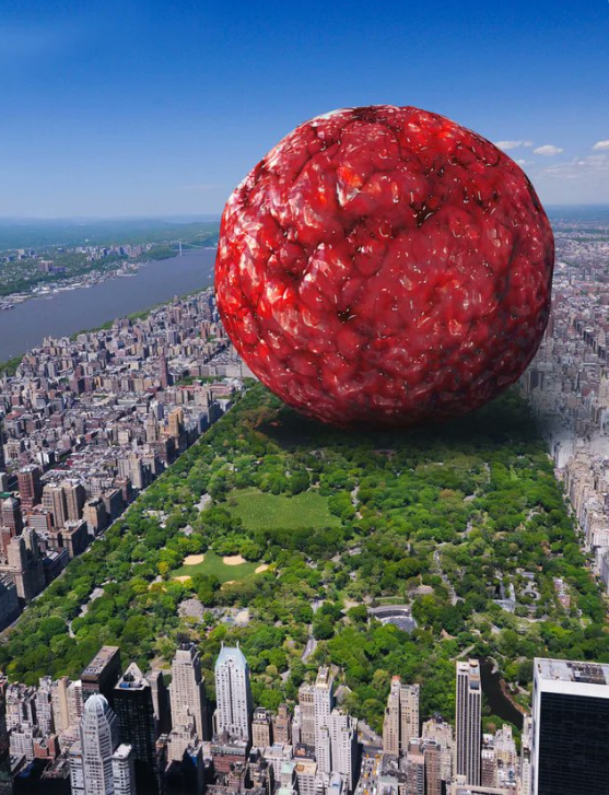 If you blended all 7.88 billion ppl on Earth into a fine goo (density of a human=985 kg/m3, average human body mass=62 kg), you would end up with a sphere of human goo just under 1 km wide. This is a visualization of how that would look like in Central Park.