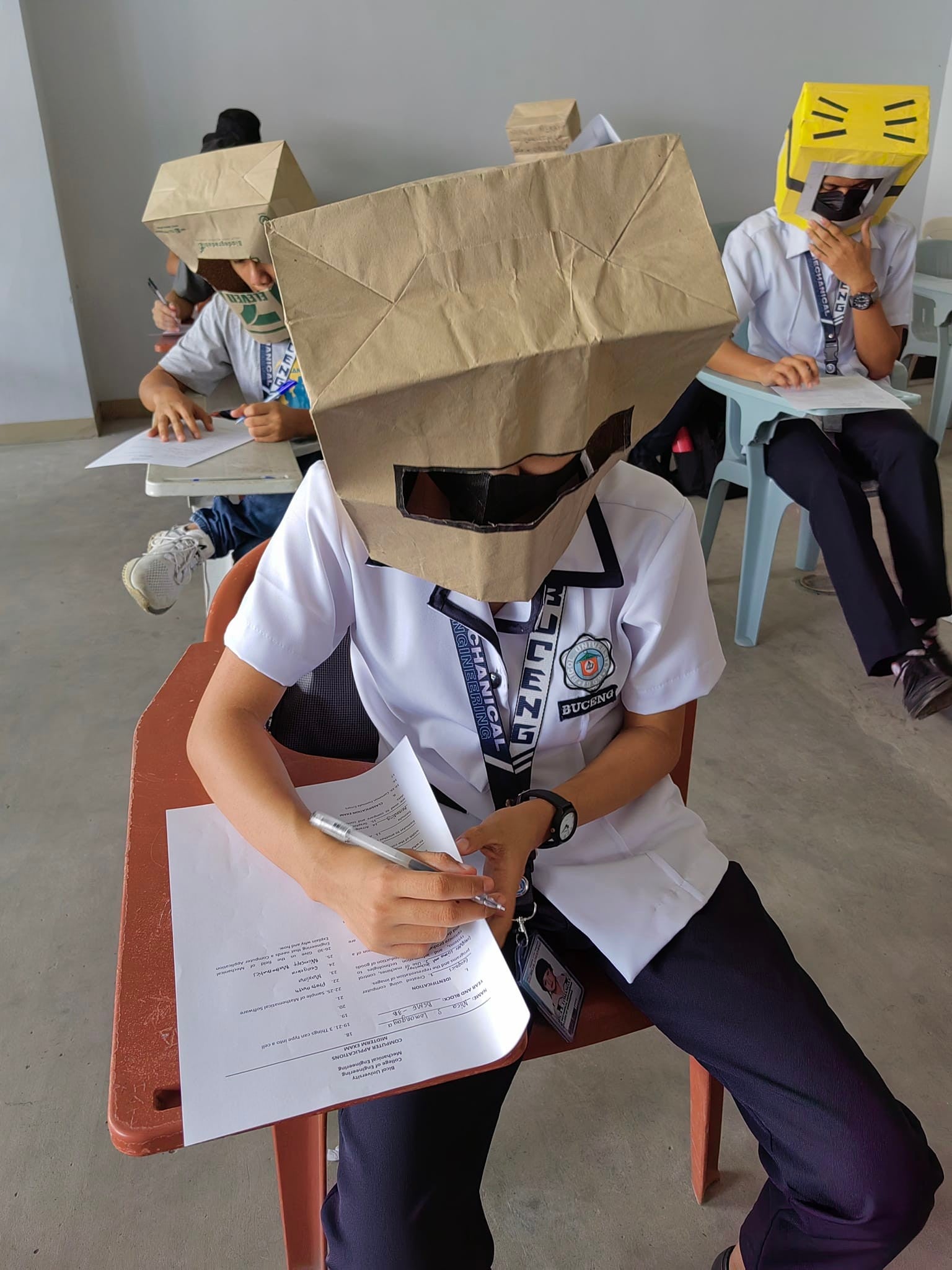 Ein philippinisches College möchte dem Schummeln nun endgültig den Gar ausmachen. Die Vorgabe, um an der Prüfung teilnehmen zu können, war, eine Kopfbedeckung zu tragen, welche das Sichtfeld so einschränken würde, um nicht auf die Antworten seines Sitznachbarn sehen zu können. Ein "einfaches" Design aus Papier sollte dabei völlig reichen, hieß es seitens der Professorin.