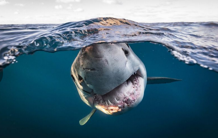 Ein Weißer Hai schwimmt mit geöffnetem Maul auf die Kamera zu und lässt den Atem der Zuschauer stocken. Der riesige Fisch wurde von Matthew Smith fotografiert, der einen Karbonstab und einen Fernauslöser für diese spektakuläre Aufnahme nutzte.