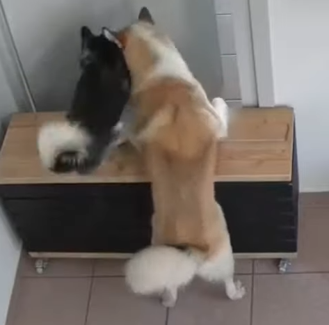 Auf dem Video ist zu sehen, wie der größere Husky die Türschnalle öffnet und das junge Tier über das Hindernis in die Küche springt. Doch der ausgewachsene Husky kommt zu Beginn nicht über den Kasten hinweg. Sein kleiner Freund kehrt zurück, springt erneut über das Hindernis und hilft seinem Freund ebenfalls in die Küche zu kommen. Welche „Speisen“ es dort dann für die Vierbeiner gab, bleibt aber ungeklärt.