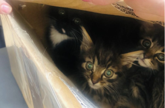 "Verzweifelte Rufe aus dem Inneren der Kiste drangen an unsere Ohren", berichtete ein Mitarbeiter, der den Vorfall auf Facebook teilte. Die Neugierde siegte, als sie die Kiste behutsam öffneten und von darin drei ängstliche Paar Katzenaugen begrüßt wurden.