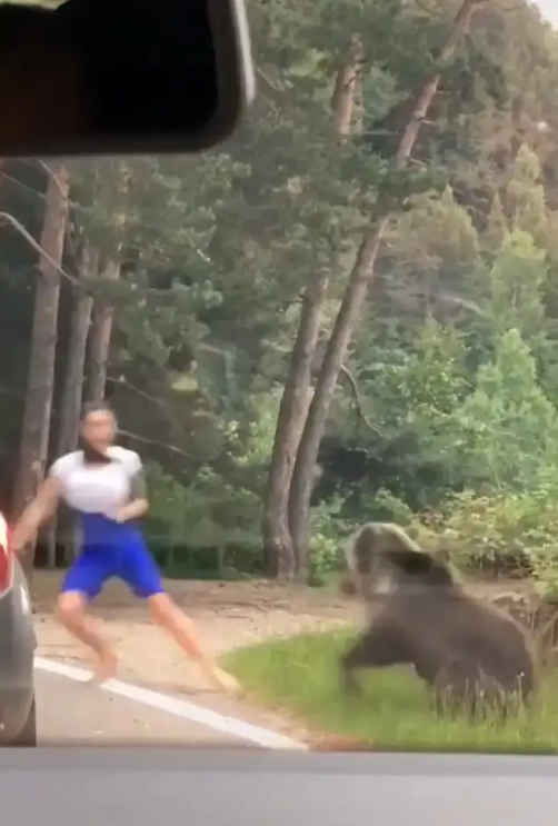 Die Leute, die sie aus einem anderen, viel weiter entfernten Auto heraus filmen, sagen daraufhin: "Ich muss das filmen, schau, wie sie ihre Hand hält, dummes Mädchen". Die Situation spitzt sich zu, als sich der Bär plötzlich auf die Frau stürzt und ihr den Schrecken ihres Lebens einjagt. Sie dreht sich schnell um und sprintet in ihr Auto. Der Bär bleibt nach dem kurzen Aufschrecken der Frau wieder stehen.