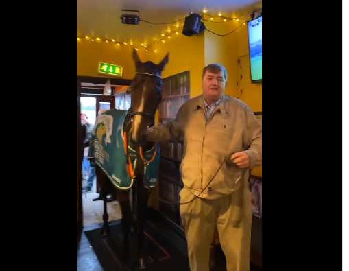 Doch was die Pferdesportfans in dem Pub "The Pint Depot" in County Carlow nicht wussten, dass auch das Siegerpferd mitkommen wird. In einem Video wird die große Überraschung gezeigt. Es wurde bereits 200.000 Mal aufgerufen.