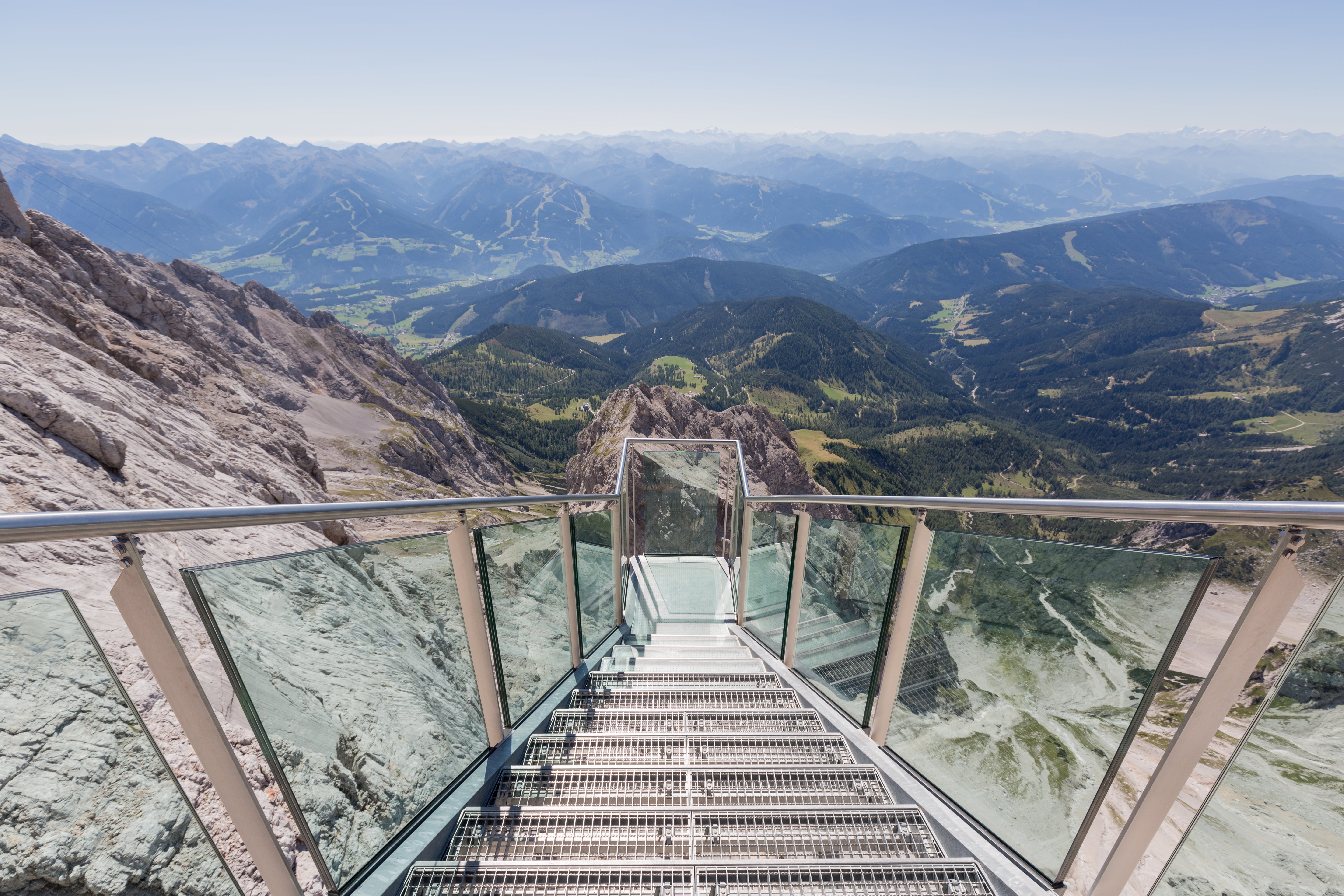 Eine ganz besondere Mutprobe gibt es am Dachstein mit der sogenannten "Treppe ins Nichts". Dabei handelt es sich um, wie es der Name verrät, eine Treppe, welche hinaus über die Klippe, aber nirgends hinführt. Am Ende der 14 Stufen befindet sich eine Glasplatte, durch die man rund 400 Meter in die Tiefe blicken kann.