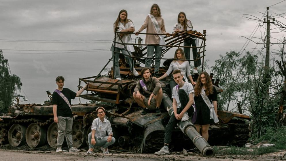 Der Schulabschluss bleibt den meisten ein Leben lang in Erinnerung. Diese ukrainischen Schüler müssen ihr Abschlussfoto aber wegen des russischen Einmarschs vor einem zerstörten Panzer machen.