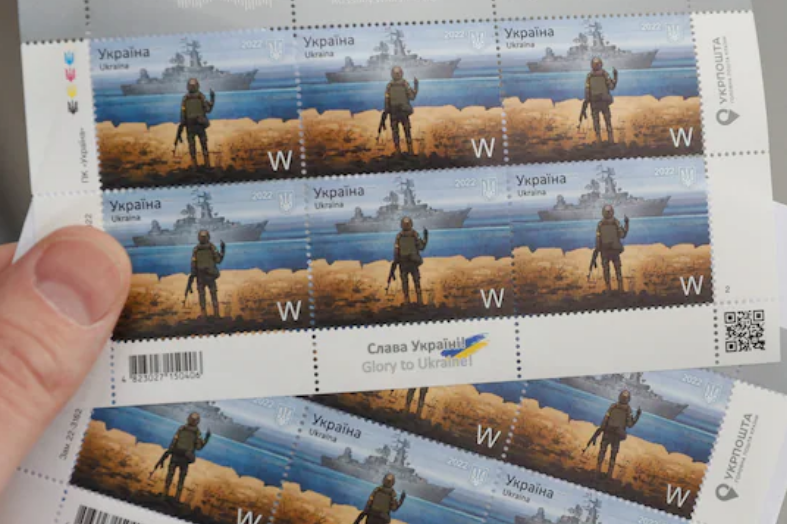 Etwa 700.000 Briefmarken, auf denen ein ukrainischer Kämpfer zu sehen ist, der den Mittelfinger vor dem gesunkenen Flaggschiff der russischen Schwarzmeerflotte zeigt, wurden innerhalb einer Woche verkauft. Ukrainer im ganzen Land kauften eine Marke als Symbol des Sieges gegen die russischen Truppen.