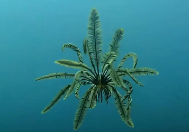Der Federstern gilt als lebendes Fossil. Von einem Unterwasserfilmer wurde der Stern aufgenommen. Eine Begegnung mit dem Stern ist äußerst selten.