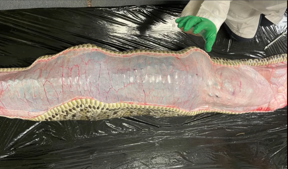 Dort wurde der Leib der Schlange geöffnet, zuerst der prall gefüllte Darm freigelegt und anschließend ganz aufgeschnitten. Was die Wissenschaftler dort vorfanden, ist kaum zu glauben. Ein ganzes Krokodil, welches vermutlich vorher von der Python erwürgt wurde, und rund 1,50 Meter groß ist.