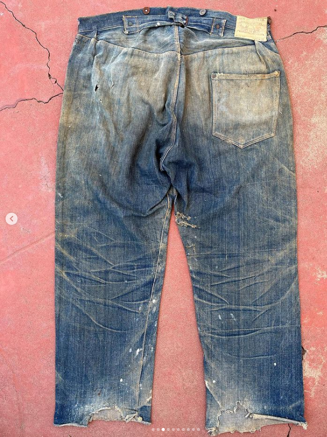 Die Jeans wurden erstmals in einem verlassenen Minenschacht im amerikanischen Westen entdeckt und stammen aus den 1880er Jahren. Sie sind mit Flecken von Kerzenwachs überzogen, aber einige der ursprünglichen Details sind noch sichtbar. Im Gegensatz zu aktuellen Levi's haben diese Vintage-Jeans Hosenträgerknöpfe am Bund und eine Gesäßtasche.
