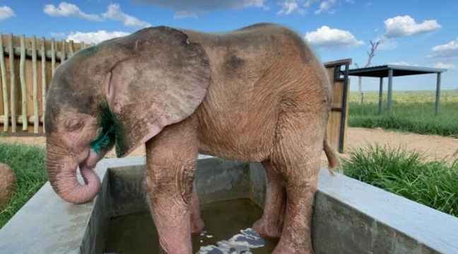 Das Kalb erlitt durch die Falle schreckliche Verletzungen, darunter eine Joker-ähnliche Narbe im Gesicht und schwere Risswunden an der Rückseite der Ohren und am Hals. Der junge Elefant, ein Weibchen namens Khanyisa, wurde mit einer einzigartigen rosa Hautfarbe geboren, im Gegensatz zu der grauen Farbe, die die Tiere normalerweise haben.