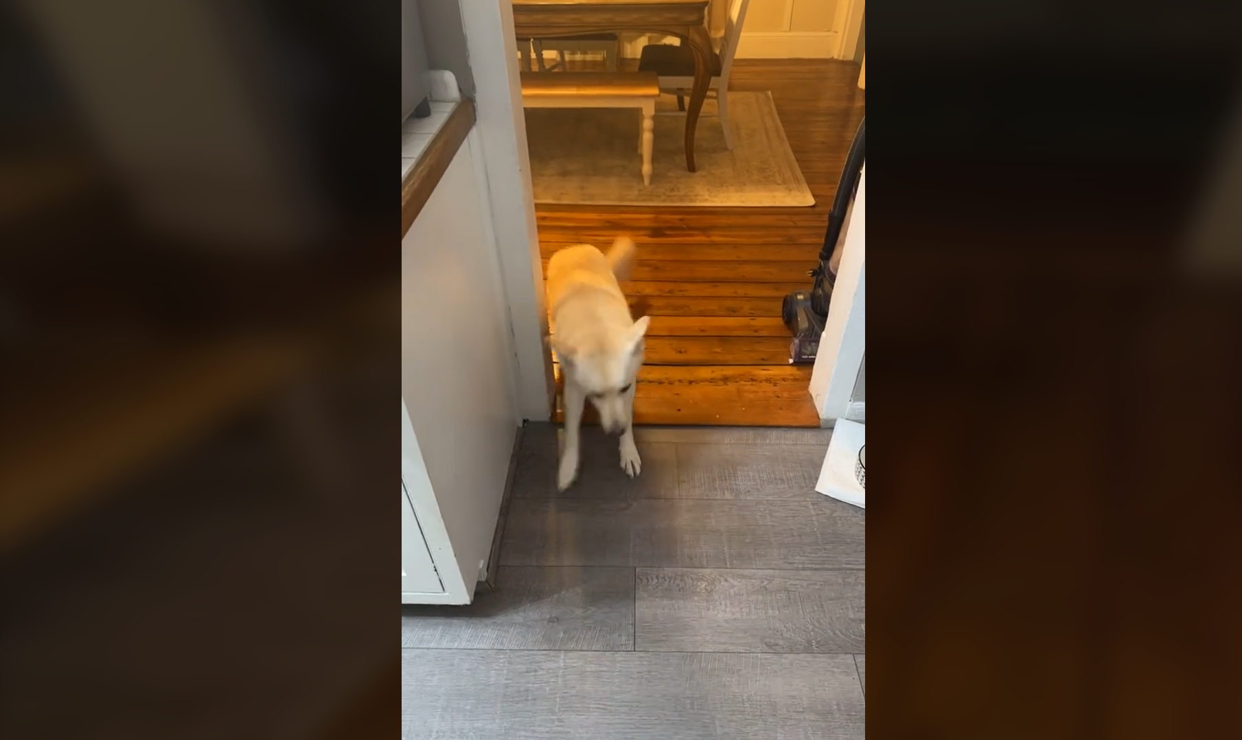 Ihr Hund hat sich als heimlicher Party-Gast entpuppt, die Flaschen geleert und taumelt jetzt herum. DIe Bilder gehen mittlerweile um die Welt.