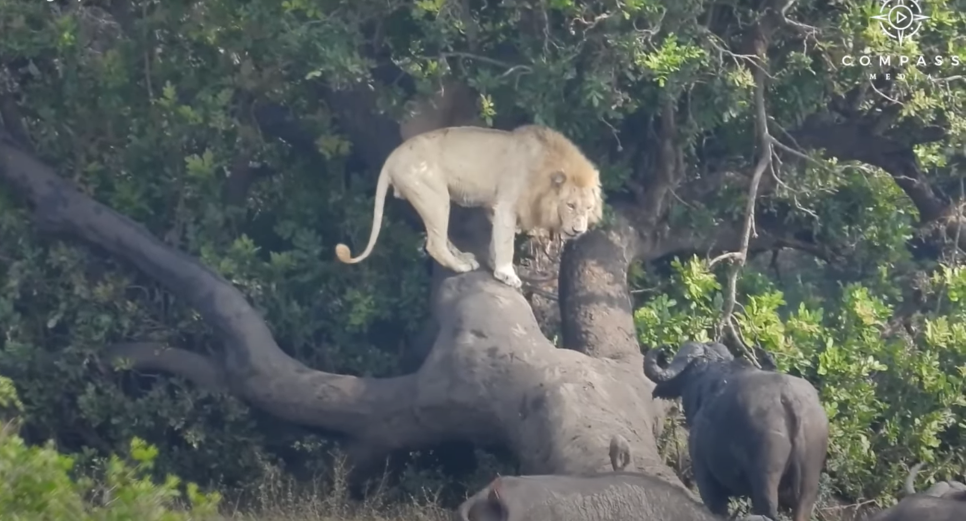 Wäre es nicht auf Video festgehalten, würde man es vermutlich nicht wirklich glauben wollen. Ein weißer Löwe, welche in Afrika als besonders selten und begehrt gelten, muss sich von seinem Platz wegbewegen, um sich vor einer Büffel-Herde in Schutz zu bringen.