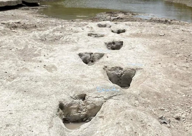 In einem texanischen Flussbett sind aufgrund der extremen Trockenheit in der Region eine Reihe von Dinosaurier-Fußabdrücken wieder aufgetaucht.