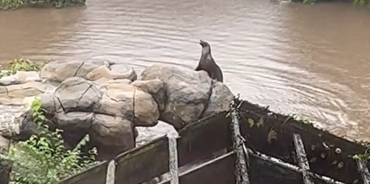 Die Seelöwin schwamm aufgrund der Überschwemmung des Platzes aus seinem Becken. Glücklicherweise behielten die Mitarbeiter den abenteuerlustigen Seelöwen genau im Auge, während er die Gegend erkundete, und kehrten dann sicher in das Becken zurück, wo er sich wieder den beiden anderen Seelöwen anschloss.