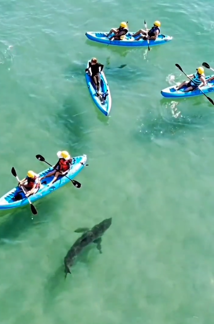 Regisseur Trystan Snodgrass hält auf seiner Kamera fest, wie ein großer Weißer Hai sich plötzlich einer Gruppe von ahnungslosen Kajak-Fahrern nähert. Das Tier schwimmt im seichten Wasser genau auf die Gruppe zu. Dann dreht es aber wieder ab. Die Kajak-Fahrer selbst scheinen den großen, noch jungen Meeresbewohner nicht gesehen zu haben.