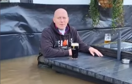 Kurioses Video aus England. Ein Pub-Besitzer ging in Folge eines Hochwassers im wahrsten Sinne des Wortes baden. Den Spaß am Bier trinken ließ er sich aber nicht nehmen.