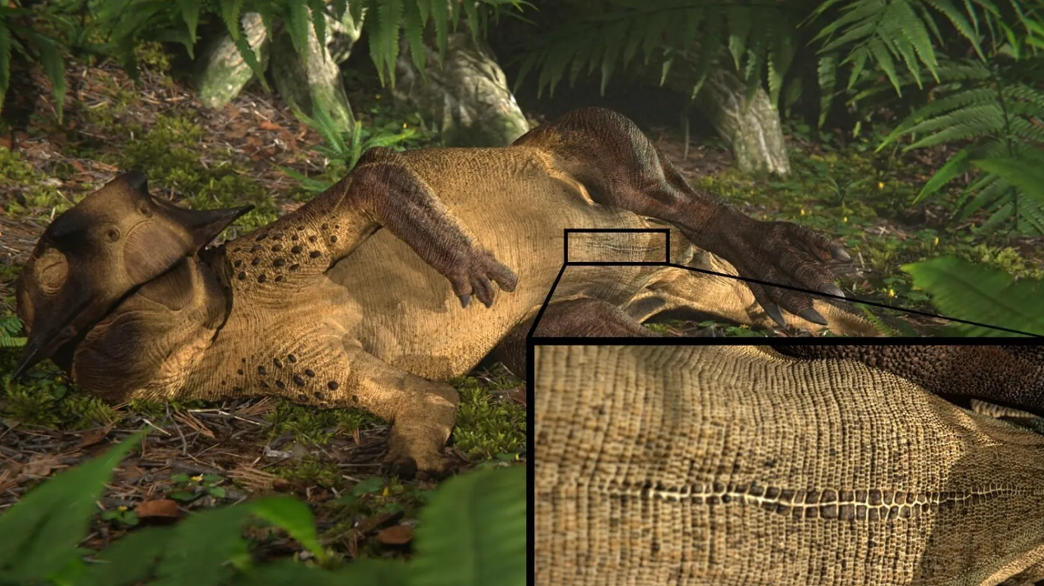 Das Psittacosaurus-Exemplar mit dem Bauchnabel wurde 2002 in China ausgegraben und auf dem Rücken liegend gefunden. Mithilfe von LSF konnte das Team jede Schuppe, jede Falte und jedes Muster auf dem erhaltenen Fossil analysieren. Das Team konnte die Nabelnarbe, die im Laufe der Zeit verblasst war, anhand einer Veränderung des Haut- und Schuppenmusters an der Stelle erkennen, an der sich der Bauchnabel des Dinos befand. Sie stellten auch fest, dass die Narbe nicht von einer verheilten Verletzung stammte, da die Nabelschuppen glatt und entlang der Mittellinie des Dinosauriers angeordnet waren.