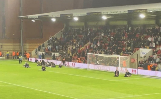 Entschlossen reagierten die Anhänger, indem sie nach und nach auf das Spielfeld liefen und sich auf dem Rasen niederließen.