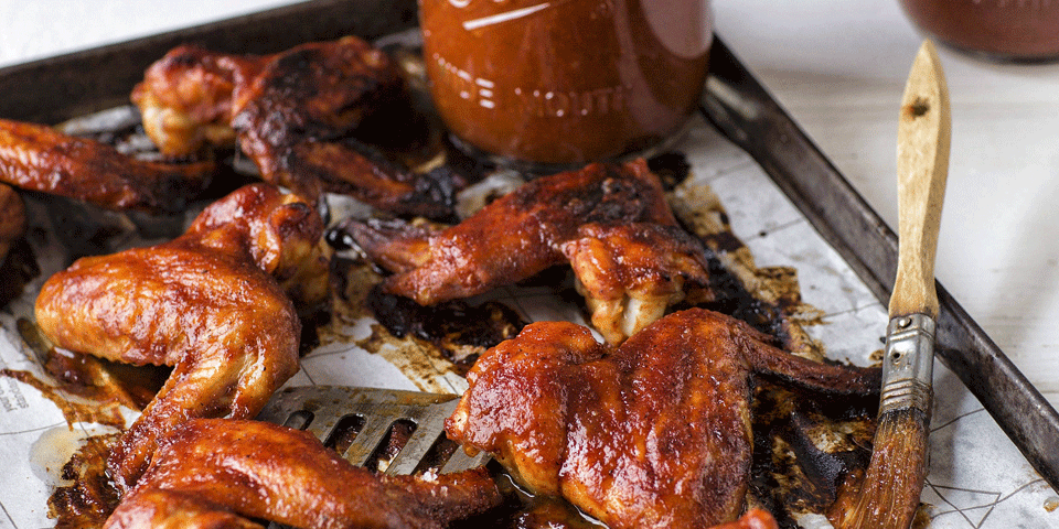 3. Die Hühnerflügel abbrausen und trocken tupfen. Mit der Barbecue-Sauce bestreichen, auf den Grill legen und 15–20 Minuten grillen. Zwischendurch immer wieder mit der Sauce bestreichen. Die Flügel mit der restlichen Barbecue-Sauce servieren.