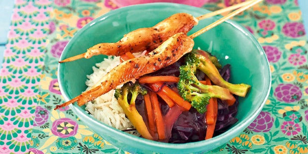 Zubereitung 1. Das Hühnerfleisch in Streifen schneiden und in eine flache Form legen. Für die Marinade den Knoblauch schälen. Das Öl mit Zitronensaft, den Gewürzen und dem Ingwer verrühren, den Knoblauch durch die Presse dazupressen. Mit Salz und Pfeffer würzen. Das Hühnerfleisch gut damit vermengen und die Form mit Alufolie verschließen. Das Geflügel mindestens 2 Stunden im Kühlschrank marinieren lassen. 2. Für die Mangosauce das Mangofruchtfleisch klein schneiden. Die Schalotte und den Knoblauch schälen und hacken. In heißem Öl andünsten, mit Zucker bestreuen und karamellisieren. Den Ingwer schälen und fein reiben. Die Mangostücke und den Ingwer zugeben und mitdünsten, mit Essig und Apfelsaft ablöschen und zugedeckt 3–5 Minuten köcheln lassen. Die Sauce pürieren und mit Salz und Cayennepfeffer abschmecken. 3. Für das Gemüse den Brokkoli putzen, waschen und in Röschen zerlegen, den Strunk klein schneiden. Die Karotten schälen und in feine Stifte schneiden. Das Kraut waschen und in feine Streifen schneiden. Das Gemüse in heißem Öl andünsten, salzen, pfeffern und den Fond angießen. Garen, bis es noch einen leichten Biss hat, dann etwa die Hälfte der Mangosauce dazugeben. 4. Das Hühnerfleisch auf Spieße stecken. Den Grill vorheizen. Alufolie auf den Grillrost legen und die Spieße draufgeben. 8–10 Minuten grillen. Die Hühnerspieße mit dem Gemüse in Schälchen anrichten. Nach Belieben dazu Reis servieren.