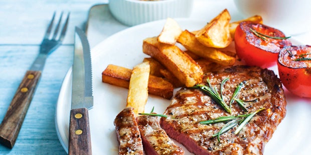 Zubereitung 1. Den Backofen auf 160 °C Umluft vorheizen. Die Erdäpfel schälen und in fingerdicke Stifte schneiden, im Rapsöl wenden und auf einem Backblech mit Backpapier verteilen. Im Ofen 35–40 Minuten garen und dabei ein- bis zweimal wenden. 2. In der Zwischenzeit die Rumpsteaks abbrausen und mit Küchenpapier trocken tupfen. Mit Salz und Steakpfeffer würzen. Die Paradeiser waschen und halbieren, den Rosmarin waschen, trocken schütteln und die Blätter von den Zweigen streifen. 3. Die Rumpsteaks auf dem Grill von beiden Seiten je ca. 3–4 Minuten braten. Nach dem Wenden mit Rosmarinblättern belegen und die Paradeiserhälften mit der Schnittfläche nach unten auf dem Grill verteilen und mit den Steaks zusammen braten. Restlichen Rosmarin auf den Paradeisern verteilen. 4. Die Pommes aus dem Ofen nehmen und mit Salz und Pfeffer würzen. Die Steaks, die Pommes und die Paradeiser auf Tellern anrichten. Dazu, nach Belieben, einen Feldsalat servieren.