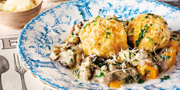350 g gemischte Pilze Zubereitung 1. Den Kürbis in große Stücke schneiden und über Wasserdampf ca. 25 Minuten gar dämpfen. Anschließend durch die Kartoffelpresse drücken. Vollständig ausdampfen lassen. Den Kürbisschnee in eine Schüssel geben und abgedeckt mindestens 2 Stunden kalt stellen. Die Semmelwürfel in eine Schüssel geben. Die Milch aufkochen lassen, darüber gießen und etwa 10 Minuten ziehen lassen. 2. Währenddessen die Pilze gründlich säubern und je nach Größe ganz lassen oder in Stücke schneiden. Das Fleisch waschen, trocken tupfen und in mundgerechte Würfel schneiden. Den Kürbis ebenfalls mundgerecht würfeln. Den Knoblauch schälen und fein hacken. Den Lauch putzen, waschen und in feine Streifen schneiden. 3. Die eingeweichten Semmeln mit dem Kürbis in eine große Schüssel füllen. Die Eier dazuschlagen, den Grieß, die Stärke und die Butter zugeben. Mit Salz, Pfeffer und Muskat kräftig würzen und alles zu einem geschmeidigen, gut formbaren Teig verkneten. Nach Bedarf noch etwas Stärke ergänzen. Mit feuchten Händen 8 Knödel formen. 4. Einen großen Topf Salzwasser zum Kochen bringen. Die Knödel vorsichtig hineingleiten lassen, die Temperatur zurückschalten und ca. 20 Minuten gar ziehen lassen. Das Fleisch in 1 EL heißem Öl kurz braun anbraten. Aus der Pfanne nehmen. Die Butter hineingeben, die Pilze ebenfalls kurz anbraten und wieder aus der Pfanne nehmen. Nun den Lauch, den Knoblauch und den Kürbis im übrigen Öl andünsten. 5. Mit dem Weißwein und der Suppe ablöschen und bei geschlossenem Deckel ca. 5 Minuten köcheln lassen. Das Obers und die Crème fraîche zugeben, leicht sämig werden lassen und die Pilze sowie das Fleisch wieder dazugeben. Etwa 5 Minuten garen und mit Salz und Pfeffer abschmecken. Das Ragout auf Teller verteilen. Die Knödel mit einem Schaumlöffel herausheben und darauf setzen. Mit dem Käse und Petersilie bestreut servieren. |