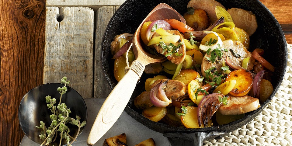 Zutaten 1 kg festkochende Erdäpfel, am Vortag gegart 1 Lauchstange 2 rote Zwiebeln 180 g Steinpilze 400 g Schweinefilet, küchenfertig 6–8 EL Rapsöl, 1–2 EL Butter Salz, Pfeffer aus der Mühle 4 EL frisch gehackte Kräuter, z. B. Petersilie und Majoran