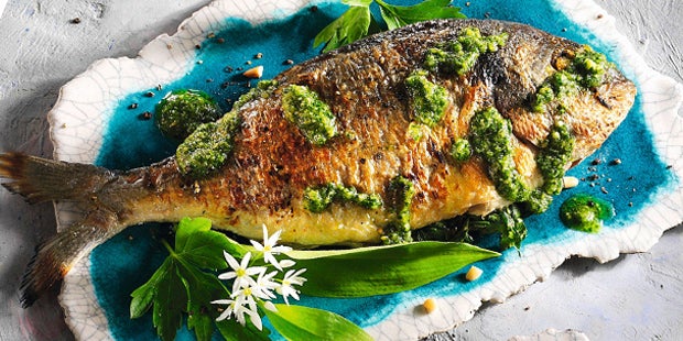 Dauer: 26 min Schwierigkeit: leicht Portionen: 4 Zutaten 4 Doraden, küchenfertig (à ca. 400 g) Salz, Pfeffer 2–3 EL Mehl 40 g Butterschmalz zum Braten 100 g Bärlauchpesto Zitronenschnitze zum Servieren Zubereitung 1. Die Doraden innen und außen gründlich unter fließendem Wasser waschen und anschließend trocken tupfen. 2. Innen und außen mit Salz und Pfeffer würzen und im Mehl wenden. Im heißen Butterschmalz in einer großen Pfanne auf jeder Seite ca. 8 Minuten langsam goldbraun braten. Zwischendurch ab und zu mit dem Schmalz übergießen. Aus der Pfanne nehmen und auf Küchenpapier abtropfen lassen. 3. Mit dem Bärlauchpesto garnieren und dazu ein paar Zitronenschnitze reichen. |