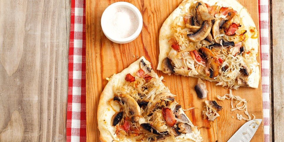 5. Das Sauerkraut mit Salz, Kümmel und Pfeffer abschmecken und das Gewürzsäckchen wieder entfernen. Auf Tellern anrichten, darauf die Schupfnudeln mit dem Speck legen und servieren.