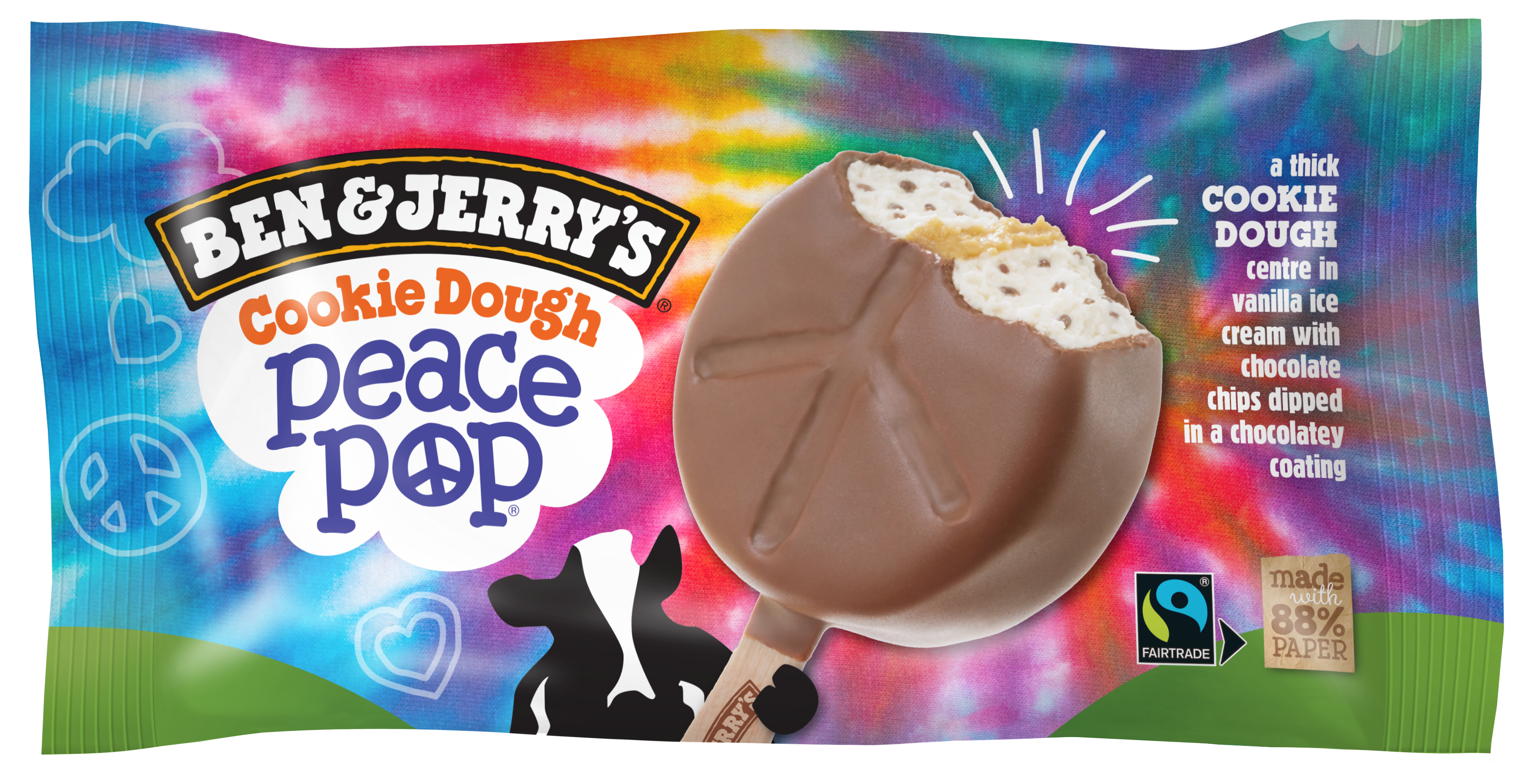 Als kleine Snack-Variante und für Einsfans, die Ben & Jerry’s erstmals probieren wollen, gibt es seit diesem Jahr das ERSTE Ben & Jerry’s am Stiel, das Ben & Jerry’s Cookie Dough Peace Pop: das ist Cookie Dough Eiscreme in Peace Zeichen Form mit einem Kern aus weichem Keksteig / Cookie Dough mit seiner typisch buttrig süß-salzigen Note.