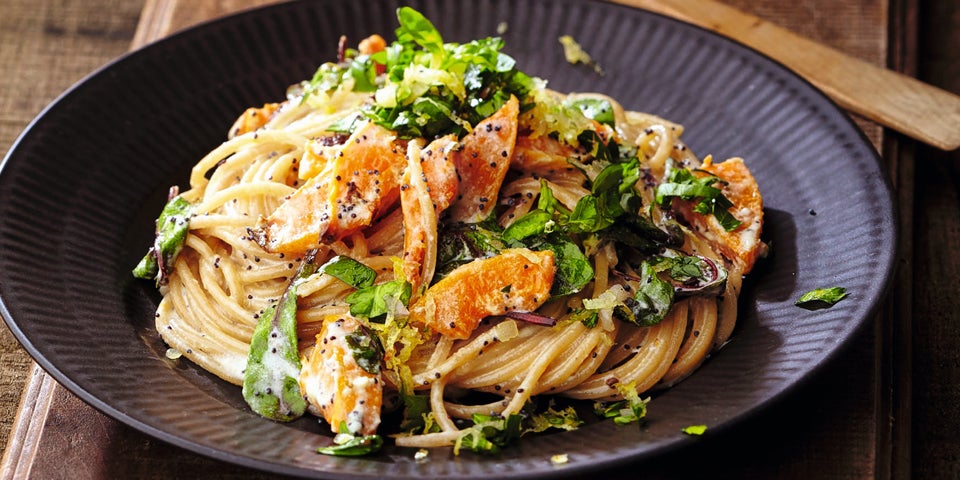 5. Die Spaghetti abschmecken, in tiefe Teller verteilen und mit Mohn bestreut servieren.