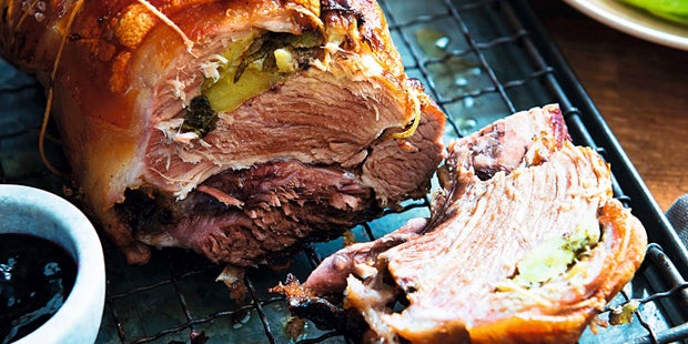 Dauer: 3 h Schwierigkeit: leicht Portionen: 4–6 Zutaten 1 säuerlicher Apfel 1 Handvoll Salbei 1 kg Schweinsbraten, z. B. Schulter, mit Schwarte grobes Salz Cayennepfeffer Kümmel, gemahlen 3 Schalotten ca. 250 ml Fleischfond Zubereitung 1. Den Ofen auf 180°C Unter- und Oberhitze vorheizen. Den Apfel schälen, vierteln, Kerngehäuse ausschneiden und die Viertel würfeln. Den Salbei abbrausen, trocken schütteln und zu den Apfelwürfeln geben. Das Fleisch waschen, trocken tupfen und eine Tasche einschneiden. Mit dem Apfel und Salbei befüllen und den Braten mit Küchengarn in Form binden. 2. Mit Salz, Pfeffer und Kümmel einreiben und mit der Schwarte nach unten in einen Bräter legen. Die Schalotten häuten, halbieren und rundherum verteilen. Den Fond angießen und im vorgeheizten Ofen ca. 30 Minuten garen. Dann wenden und mit der Schwarte nach oben weitere ca. 2 Stunden braten. Dabei ab und zu mit dem Bratensaft begießen. 3. Zum Schluss den Braten aus der Bratenflüssigkeit nehmen und auf das Gitter im Ofen legen, darunter ein Backblech einschieben. Die Ofentemperatur auf 240 °C Oberhitze erhöhen und einige Minuten weiterbraten, um eine schöne Kruste zu bekommen. 4. Nach Belieben in der Zwischenzeit die Bratflüssigkeit mit den Schalotten passieren und abschmecken. Den fertigen Braten vom Garn befreien und in Scheiben geschnitten servieren. Dazu nach Belieben z. B. eine Pflaumensauce reichen. |