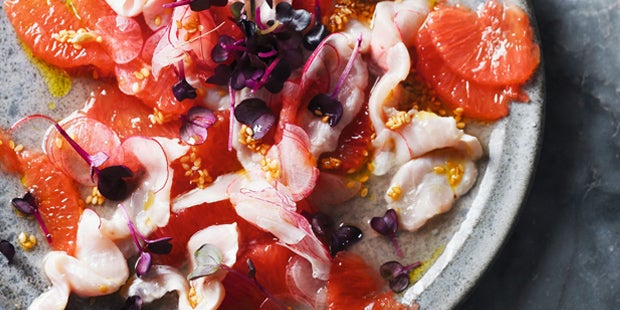Portionen: 4 (Vorspeise) Zutaten 400 g frisches Saiblings- oder Forellenfilet ohne Haut Saft von 3 Limetten 1 cm Ingwer ½ TL Sesamsamen ½ TL Sesamöl, 1 TL Olivenöl 4 Radieschen, 1 Grapefruit 1 Schälchen violette Kresse Fleur de Sel frisch gemahlener Pfeffer Zubereitung 1. Fischfilet kalt abspülen und mit Küchenpapier trocken tupfen, eventuell noch vorhandene Gräten entfernen. Das Filet in feine Scheiben oder Würfel schneiden und in eine Schüssel geben. 1 TL Limettensaft für die Marinade zurückbehalten, den übrigen Saft über den Fisch träufeln. Mit Frischhaltefolie abdecken und mindestens 20 Minuten im Kühlschrank ziehen lassen. 2. Ingwer fein reiben und mit Sesamsamen, Sesamöl, Olivenöl und 1 TL Limettensaft zu einer Marinade rühren. Fisch auf Tellern anrichten, mit Fleur de Sel und der Sesam-Marinade würzen. 3. Radieschen fein hobeln und auf der Ceviche verteilen. Grapefruit mit einem scharfen Messer schälen, dabei auch die weiße Haut entfernen. Grapefruit in Scheiben oder Filets aus den Membranen schneiden und mit der Ceviche anrichten. Mit Pfeffer würzen und mit Kresse garnieren. |
