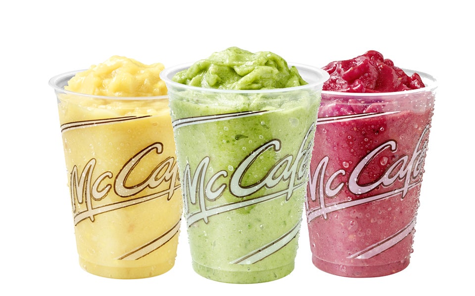 McDonald's springt auf den Smoothie-Hype auf. Ab sofort gibt es in den österreichischen McCafés drei Smoothie-Sorten, welche vor Ort gemixt werden. "Der Rote" wird aus Apfel, Himbeere, Mango und Heidelbeere zubereitet, "Der Gelbe" aus Ananas, Mango und Papaya."Der Grüne" ist ein Banane-Grünkohl-Mango-Zitronengras-Mix. Alle drei Geschmacksrichtungen aus 100% Frucht und Gemüse.