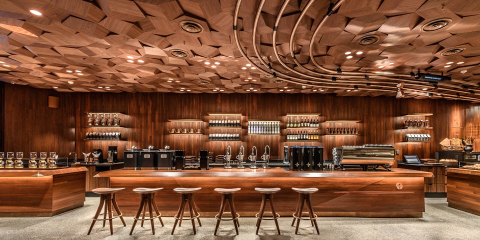 Die Kunden erwartet in dem Superlative-Standort so einiges: Schon beim Betreten begrüßt sie der atemberaubende Anblick eines zweistöckigen Kupferfasses, in dem der hauseigene Kaffee frisch geröstet wird. Letzteres ist mit mehr als 1.000 traditionellen chinesischen Stempeln verziert, die allesamt handgraviert wurden, um die Geschichte von Starbucks und dessen Reserve-Kaffees zu erzählen.